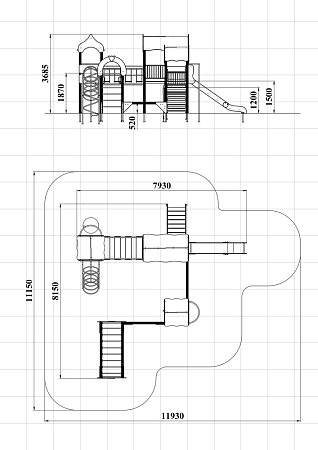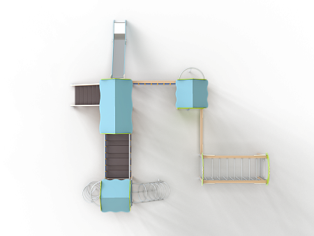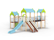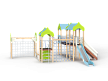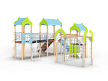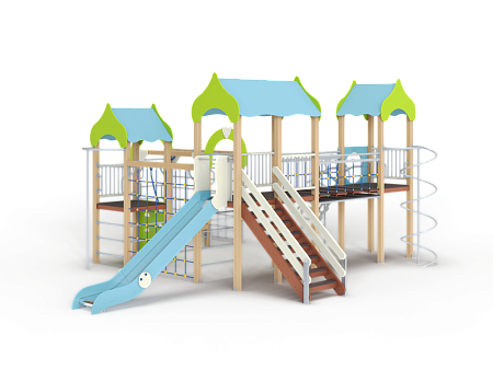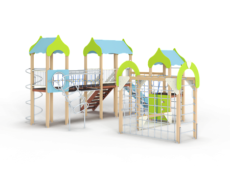 Детский игровой комплекс состоит из трёх башен с крышами. На первой башне установлена альпинистская стенка с перекладиной и канатом, швед-ская стенка, шест, ограждение и ручки вспомога-тельные. На второй башне установлены горка, ограждения, лестница, шведская стенка. На треть-ей башне установлены спираль наклонная, ограж-дение, шест спираль, ручки вспомогательные и пе-рекладина. Первая и вторая башни соединены сет-кой полипропиленовой, вторая и третья соедине-ны подвесным мостом. К первой башне присоеди-нен с помощью бум бревна гимнастический ком-плекс с рукоходом, сеткой металлической, двумя шведскими стенками и декоративными арками