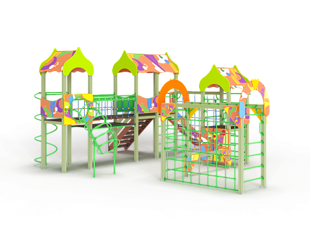 Детский игровой комплекс состоит из трёх башен с крышами, имеет художественное оформление в стиле граффити. На первой башне установлена альпинистская стенка с перекладиной и канатом, шведская стенка, шест, ограждение и ручки вспомогательные. На второй башне установлены горка, ограждения, лестница, шведская стенка. На третьей башне установлены спираль наклонная, ограждение, шест спираль, ручки вспомогательные и перекладина. Первая и вторая башни соединены сеткой полипропиленовой, вторая и третья соединены подвесным качающимся мостом. К первой башне присоединен с помощью бум бревна гимнастический комплекс с рукоходом, сеткой вертикальной металлической, двумя шведскими стенками и декоративными арками.