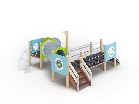 Детский игровой комплекс состоит из трех башен. На первой башне установлены трап, ограждение с иллюминатором, ручки вспомогательные, перекладины. На второй башне установлены лестница, ручки вспомогательные, ограждение с иллюминатором и два декоративных фанерных флажка. На третьей башне установлены лиана наклонная, горка-труба пластиковая, ограждение с иллюминатором и перекладина. Первая и вторая башня соединены подвесным качающимся мостом, вторая и третья башни соединены пластиковой изогнутой трубой переходом.