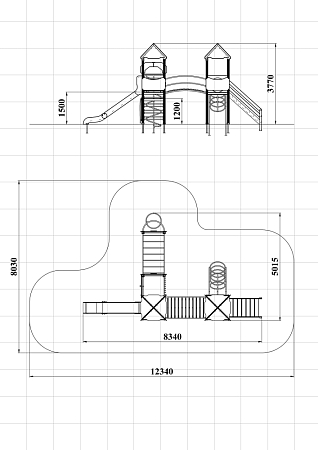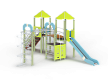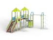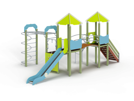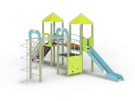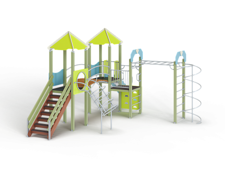 Детский игровой комплекс состоит из двух башен и одной полубашни с вынесенной шведской стенкой. На первой башне с полубашней установлена альпинистская стенка с перекладиной и канатом, ограждение металлическое, вспомогательные ручки, шведская стенка и примыкающий к ней рукоход с вынесенной шведской стенкой, две декоративные арки, со стороны вынесенной шведской стенки установлен шест спираль. На второй башне установлена горка, крыша и ограждение. На третьей башне установлена крыша, лестница, ограждение и спираль наклонная. Вторая и третья башня соединены радиусным мостом с металлическими перилами.
