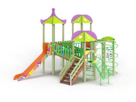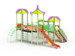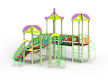 Детский игровой комплекс состоит из трех башен с крышами, имеет художественное оформление в стиле граффити. На первой башне установлена лестница, спираль наклонная, ручки вспомогательные, ограждение с круглым лазом, вынесенная шведская стенка с рукоходом, перекладиной с гимнастическими кольцами и шестом спиралью. На второй башне установлена горка и фанерное ограждение. На третьей башне установлена лиана, ручки вспомогательные, ограждение фанерное с декоративными элементам и шведская стенка. Первая и вторая башни соединяются разновысоким мостом с фанерными перилами. Вторая и третья башни соединены подвесным качающимся мостом с фанерным ограждением.