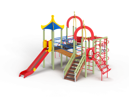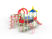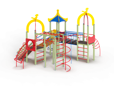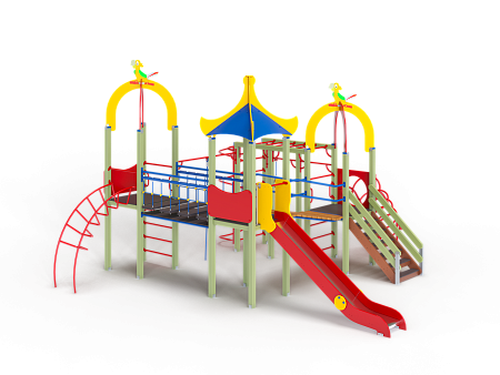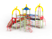 Детский игровой комплекс состоит из трех башен с крышами. На первой башне установлена лестница, спираль наклонная, ручки вспомогательные, ограждение с круглым лазом, вынесенная шведская стенка с рукоходом, перекладиной с гимнастическими кольцами и шестом спиралью. На второй башне установлена горка и фанерное ограждение. На третьей башне установлена лиана, ручки вспомогательные, ограждение фанерное и шведская стенка. Первая и вторая башни соединяются разновысоким мостом с металлическими перилами. Вторая и третья башни соединены подвесным качающимся мостом.