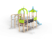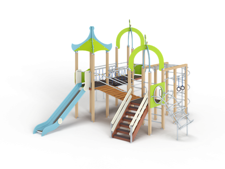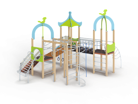 Детский игровой комплекс состоит из трех башен с крышами. На первой башне установлена лестница, спираль наклонная, ручки вспомогательные, ограждение с круглым лазом, вынесенная шведская стенка с рукоходом, перекладиной с гимнастическими кольцами и шестом спиралью. На второй башне установлена горка и фанерное ограждение. На третьей башне установлена лиана, ручки вспомогательные, ограждение фанерное и шведская стенка. Первая и вторая башни соединяются разновысоким мостом с металлическими перилами. Вторая и третья башни соединены подвесным качающимся мостом.