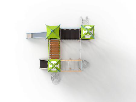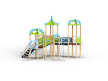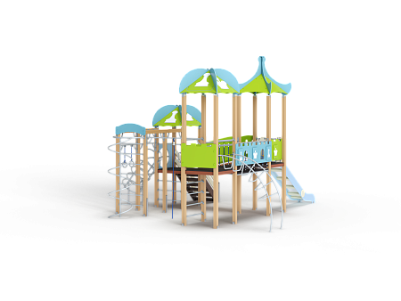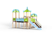 Детский игровой комплекс состоит из трех башен с крышами. На первой башне установлена лестница, спираль наклонная, ручки вспомогательные, ограждение с круглым лазом, вынесенная шведская стенка с рукоходом, перекладиной с гимнастическими кольцами и шестом спиралью. На второй башне установлена горка и фанерное ограждение с декоративными элементами. На третьей башне установлена лиана, ручки вспомогательные, ограждение фанерное с декоративными элементам и шведская стенка. Первая и вторая башни соединяются разновысоким мостом с фанерными перилами. Вторая и третья башни соединены подвесным качающимся мостом с фанерным ограждением и декоративными элементами.