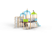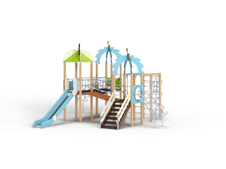 Детский игровой комплекс состоит из трех башен с крышами. На первой башне установлена лестница, спираль наклонная, ручки вспомогательные, ограждение с круглым лазом, вынесенная шведская стенка с рукоходом, перекладиной с гимнастическими кольцами и шестом спиралью. На второй башне установлена горка и фанерное ограждение. На третьей башне установлена лиана, ручки вспомогательные, ограждение фанерное и шведская стенка. Первая и вторая башни соединяются разновысоким мостом с металлическими перилами. Вторая и третья башни соединены подвесным качающимся мостом.