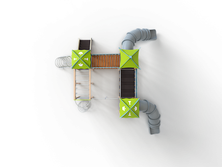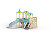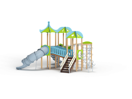 Детский игровой комплекс состоит из трех башен с крышами. На первой башне установлена лестница, спираль наклонная, ручки вспомогательные, ограждение с круглым лазом, вынесенная шведская стенка с рукоходом, перекладиной с гимнастическими кольцами и шестом спиралью. На второй башне установлена горка-труба пластиковая и фанерное ограждение с декоративными элементами. На третьей башне установлена горка-труба пластиковая, ручки вспомогательные, ограждение фанерное с декоративными элементам и шведская стенка. Первая и вторая башни соединяются разновысоким мостом с фанерными перилами. Вторая и третья башни соединены подвесным качающимся мостом с фанерным ограждением с декоративными элементам.