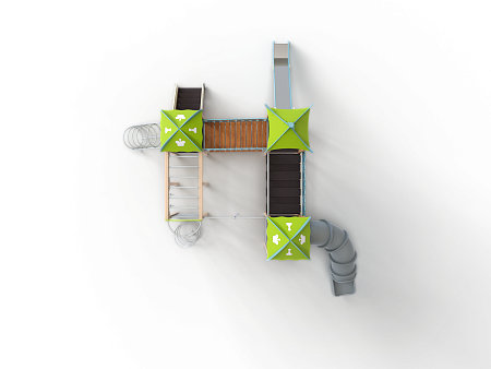 Детский игровой комплекс состоит из трех башен с крышами. На первой башне установлена лестница, спираль наклонная, ручки вспомогательные, ограждение с круглым лазом, вынесенная шведская стенка с рукоходом, перекладиной с гимнастическими кольцами и шестом спиралью. На второй башне установлена горка и фанерное ограждение с декоративными элементами. На третьей башне установлена горка-труба пластиковая, ручки вспомогательные, ограждение фанерное с декоративными элементам и шведская стенка. Первая и вторая башни соединяются разновысоким мостом с фанерными перилами. Вторая и третья башни соединены подвесным качающимся мостом с фанерным ограждением и декоративными элементами.