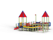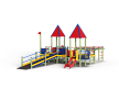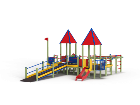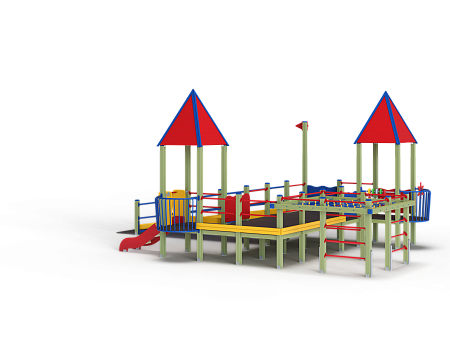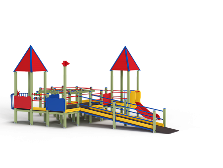 Детский игровой комплекс предназначен для детей с ограниченными физическими возможностями, он состоит из пяти сдвоенных открытых башен и двух башен с пирамидальными крышами. На одной из башен установлена горка, балкон, металлическое ограждение из перекладин. На другой башне установлено фанерное ограждение, балкон с фанерным рулём и комплект детских счет с разноцветными пластиковыми бубликами. Обе башни расположены диагонально друг напротив друга. Между ними расположены пять двойных площадок с ограждениями по периметру из металлических перекладин и фанерных ограждений. Вход на площадку осуществлен в виде двойного наклонного трапа с металлическими перилами. Сбоку от площадки расположен спортивный комплекс, состоящий из столбов, шведских стенок и горизонтальной полипропиленовой сетки. Ограждением комплекса также служит брус расположенный по периметру комплекса над ламинированными полами. В углу комплекса расположен столб с декоративными фанерными флажками.