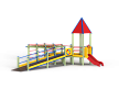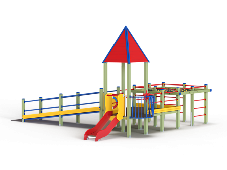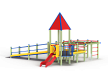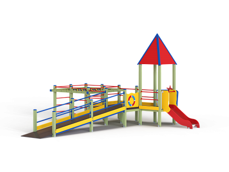 Детский игровой комплекс предназначен для детей с ограниченными физическими возможностями, он состоит из двух сдвоенных открытых башен и башни с пирамидальной крышей. На башне установлена горка, балкон с фанерным штурвалом, металлическое ограждение из перекладин. По периметру комплекса установлены ограждения из металлических перекладин и одного фанерного ограждения с декоративным элементом. Вход на площадку осуществлен в виде двойного наклонного трапа с металлическими перилами. Сбоку от площадки расположен спортивный комплекс, состоящий из столбов, шведских стенок и горизонтальной полипропиленовой сетки. Ограждением комплекса также служит брус расположенный по периметру комплекса над ламинированными полами.