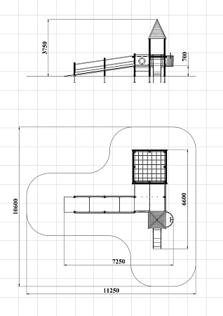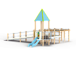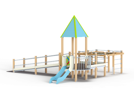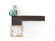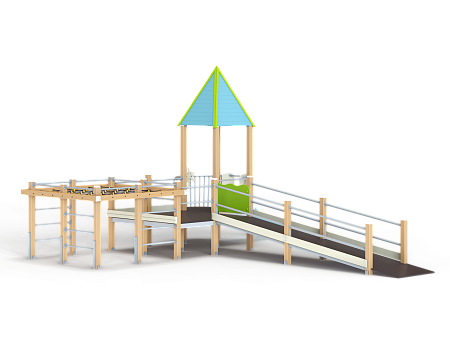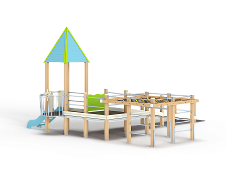 Детский игровой комплекс предназначен для детей с ограниченными физическими возможностями, он состоит из двух сдвоенных открытых башен и башни с пирамидальной крышей. На башне установлена горка, балкон с фанерным штурвалом, металлическое ограждение из перекладин. По периметру комплекса установлены ограждения из металлических перекладин и одного фанерного ограждения с декоративным элементом. Вход на площадку осуществлен в виде двойного наклонного трапа с металлическими перилами. Сбоку от площадки расположен спортивный комплекс, состоящий из столбов, шведских стенок и горизонтальной полипропиленовой сетки. Ограждением комплекса также служит брус расположенный по периметру комплекса над ламинированными полами.