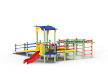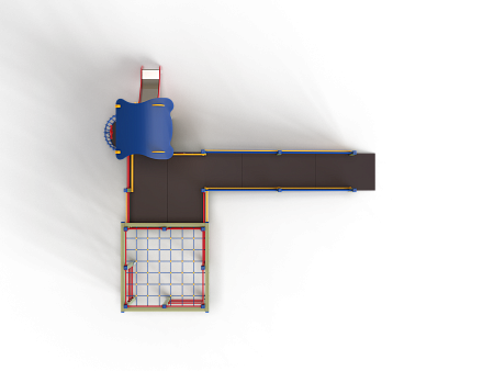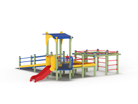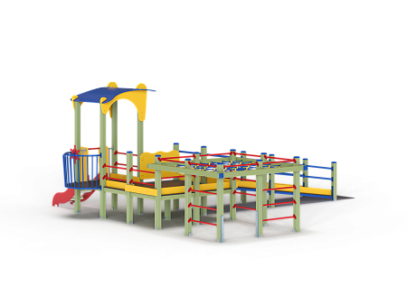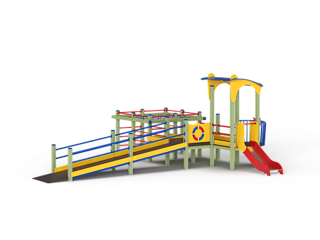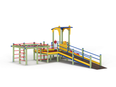 Детский игровой комплекс предназначен для детей с ограниченными физическими возможностями, он состоит из двух сдвоенных открытых башен и башни с фасонной крышей. На башне установлена горка, балкон с фанерным штурвалом, металлическое ограждение из перекладин. По периметру комплекса установлены ограждения из металлических перекладин и одного фанерного ограждения с декоративным элементом. Вход на площадку осуществлен в виде двойного наклонного трапа с металлическими перилами. Сбоку от площадки расположен спортивный комплекс, состоящий из столбов, шведских стенок и горизонтальной полипропиленовой сетки. Ограждением комплекса также служит брус расположенный по периметру комплекса над ламинированными полами.