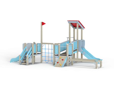 Детский игровой комплекс состоит из трёх башен с вынесенным спорткомплексом в виде бум брёвен. На первой башне установлены крыша наклонная, ограждение из бруса, шест, перекладина. На второй башне установлены трап из бруса с альпинистскими камнями, три ограждения из бруса, две перекладины и примыкающий к ней спорткомплекс. На третьей башне установлены лестница, горка, перекладина, декоративные флажки и три ограждения из бруса. Первая и вторая башни соединены наклонным мостом из бруса, вторая и третья башни соединены полипропиленовой сеткой.
