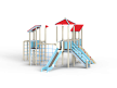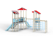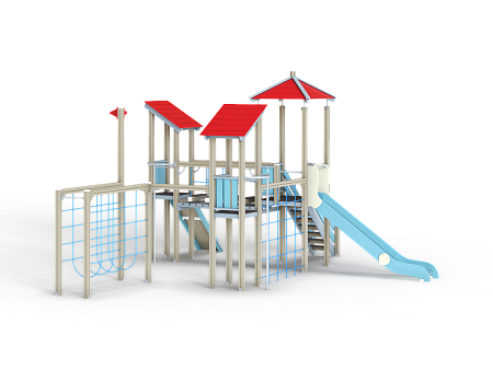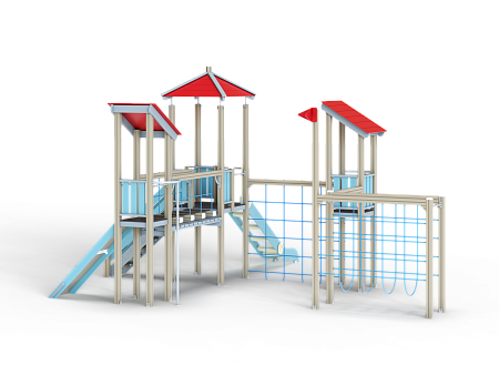 Детский игровой комплекс состоит из трёх башен с вынесенным спорткомплексом в виде канатного перехода на деревянных столбах. На первой башне установлены крыша наклонная, два ограждения из бруса, шест, две перекладины и примыкающий к ней спорткомплекс. На второй башне установлены горка, крыша четырехскатная, четыре ограждения из бруса, лестница и две перекладины. На третьей башне установлены крыша наклонная, трап из бруса с альпинистскими камнями, шест, три перекладины и ограждение из бруса. Первая и вторая башни соединены полипропиленовой сеткой, вторая и третья башни соединены мостом подвесным из деревянного бруса и полипропиленового каната.