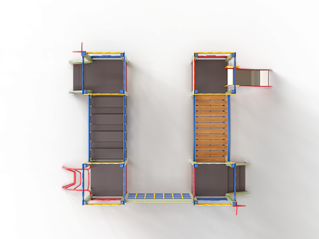 Детский игровой комплекс состоит из четырёх башен с крышами. На первой башне установлена ограждение фанерное с декоративной накладкой, лестница, перекладины и декоративные флажки. На второй башне установлено ограждение фанерное с декоративной накладкой, лиана наклонная и перекладины. На третьей башне установлено ограждение фанерное с декоративной накладкой, декоративные флажки и лестница. На четвертой башне установлено ограждение фанерное с декоративной накладкой, перекладины и горка. Первая башня соединена подвесным качающимся мостом со второй. Вторая соединяется с третьей сеткой полипропиленовой. Третья соединяется с четвёртой мостом радиусным с металлическими перилами.