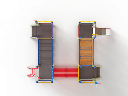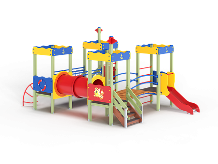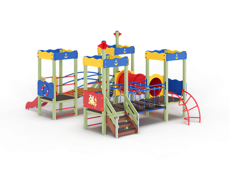 Детский игровой комплекс состоит из четырёх башен с крышами. На первой башне установлена ограждение фанерное с художественным оформлением, лестница, перекладины и декоративные флажки. На второй башне установлено ограждение фанерное с художественным оформлением, лиана наклонная и перекладины. На третьей башне установлено ограждение фанерное с художественным оформлением, декоративные флажки и лестница. На четвертой башне установлено ограждение фанерное с художественным оформлением, перекладины и горка. Первая башня соединена подвесным качающимся мостом со второй. Вторая соединяется с третьей пластиковой трубой переходом. Третья соединяется с четвёртой мостом радиусным с металлическими перилами.