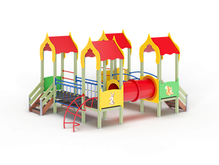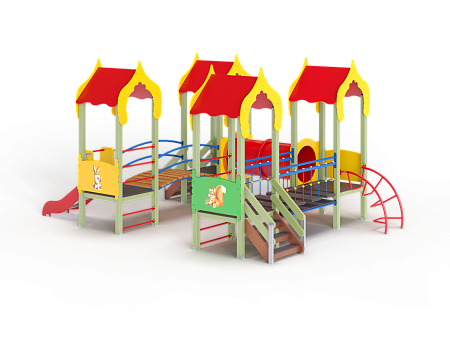 Детский игровой комплекс состоит из четырёх башен с крышами. На первой башне установлена ограждение фанерное с художественным оформлением, лестница, перекладины. На второй башне установлено ограждение фанерное с художественным оформлением, лиана наклонная и перекладины. На третьей башне установлено ограждение фанерное с художественным оформлением и лестница. На четвертой башне установлено ограждение фанерное с художественным оформлением, перекладины и горка. Первая башня соединена подвесным качающимся мостом со второй. Вторая соединяется с третьей пластиковой трубой переходом. Третья соединяется с четвёртой мостом радиусным с металлическими перилами.