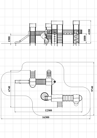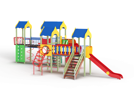 Детский игровой комплекс состоит из четырёх башен с крышами. На первой башне установлена лестница, горка, балкон, перекладина, На второй башне установлены две шведских стенки, шест с пластиковыми колесами, фанерное ограждение с круглым вырезом, спираль, ручки вспомогательные и перекладины. На третьей сдвоенной башне установлены горка винтовая пластиковая, ограждения металлические, ограждение фанерное, лестница с металлическими поручнями. На четвертой башне установлены альпинистская стенка с перекладиной и канатом, шест спираль, балкон, шведская стенка, перекладина и вспомогательные ручки. Первая и вторая башни соединены прямым мостом с фанерными перилами из балясин, вторая и третья сеткой полипропиленовой, третья и четвертая подвесным качающимся мостом.