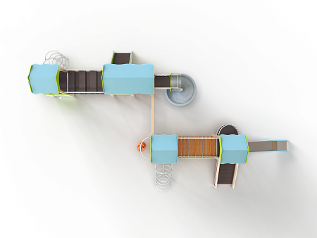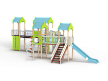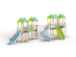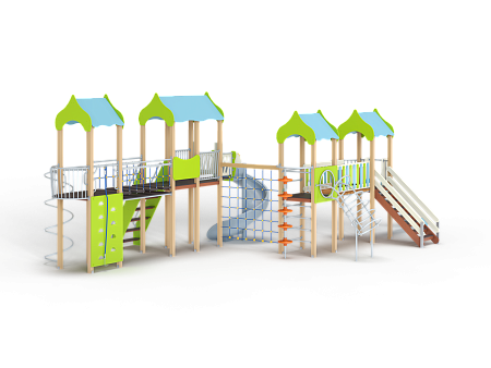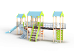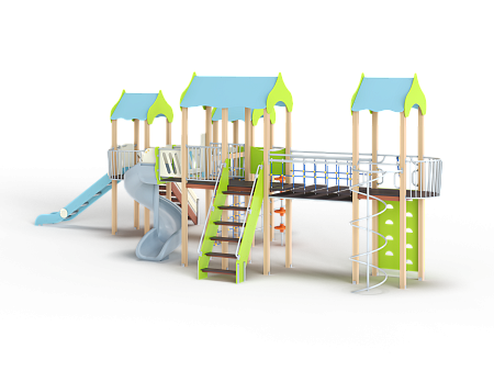 Детский игровой комплекс состоит из четырёх башен с крышами. На первой башне установлена лестница, горка, балкон, перекладина, На второй башне установлены две шведских стенки, шест с пластиковыми колесами, фанерное ограждение с круглым вырезом, спираль, ручки вспомогательные и перекладины. На третьей сдвоенной башне установлены горка винтовая пластиковая, ограждения металлические, ограждение фанерное, лестница с металлическими поручнями. На четвертой башне установлены альпинистская стенка с перекладиной и канатом, шест спираль, балкон, шведская стенка, перекладина и вспомогательные ручки. Первая и вторая башни соединены прямым мостом с фанерными перилами из балясин, вторая и третья сеткой полипропиленовой, третья и четвертая подвесным качающимся мостом.
