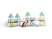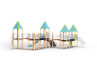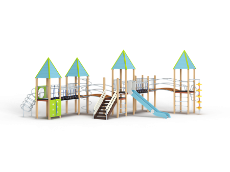 Детский игровой комплекс состоит из шести башен, на четырёх башнях установлены пирамидальные крыши. На первой башне установлена крыша, спираль, фанерное ограждение с круглым лазом, ручки вспомогательные, ограждение металлическое, альпинистская стенка с перекладиной и канатом. На второй башне установлены крыша, ограждение металлическое, шест спираль, перекладина и ручки вспомогательные. На третьей башне (полубашня) установлены лестница, перекладины и шведская стенка. На четвертой установлены крыша, ограждение металлическое, горка и ручки вспомогательные. На пятой башне установлены два металлических ограждения. На шестой башне установлены крыша, шведская стенка, лиана наклонная, шест с колесами пластиковыми, перекладины и ручки вспомогательные. Первая и вторая башни соединены подвесным качающимся мостом. Вторая и третья башни соединены радиусным мостом с металлическими перилами. Четвертая и пятая башни соеденины подвесным качающимся мостом. Пятая и шестая башни соединены радиусным мостом с металлическими перилами.