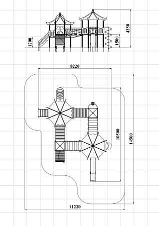 Детский игровой комплекс состоит из четырех башен. На двух башнях установлена крыша в форме восьмигранной пагоды, на двух установлена крыша металлическая со столбом. На восьмигранных башнях установлены горка, шест спираль, ручки вспомогательные, спираль наклонная, фанерное ограждение с круглым лазом, лестница и фанерные ограждения. На башнях с металлической крышей установлены шест с колесами пластиковыми, ручки вспомогательные, трап барабан с перекладиной и канатом и фанерные ограждения. Башни соединены двумя мостами наклонными и двумя подвесными качающимися мостами.