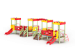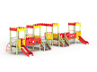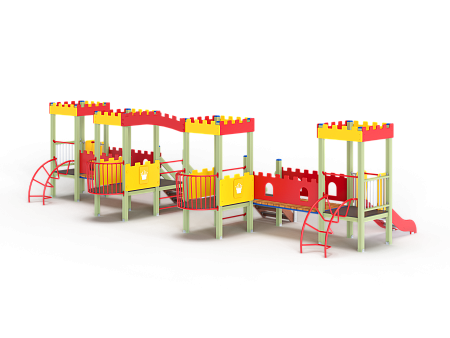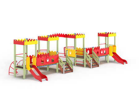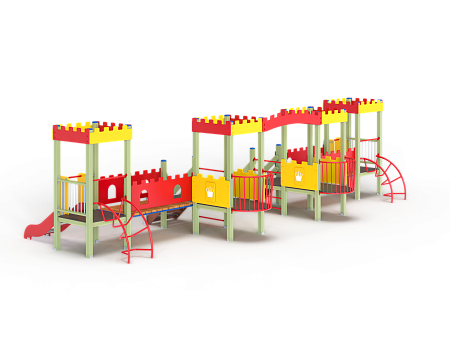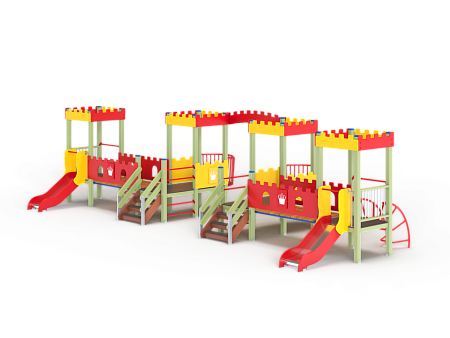 Детский игровой комплекс состоит из четырёх ба-шен с крышами. На первой башне установлена горка, перекладина, лиана и ограждение фанерное с декоративными накладками. На второй башне установлено ограждение фанерное с декоративными накладками, лестница, перекладины, балкон. На третьей башне установлено ограждение фанерное с декоративными накладками, лестница, перекладины, балкон. На четвертой башне установлена горка, перекладина, лиана и ограждение фанерное с декоративными накладками. Первая башня соединена со второй прямым мостом с фанерными перилами, третья соединяется с четвертой прямым мостом с фанерными перилами. Между второй и третьей башней установлена декоративная зубчатая фанерная арка, на уровне фасадов крыш.