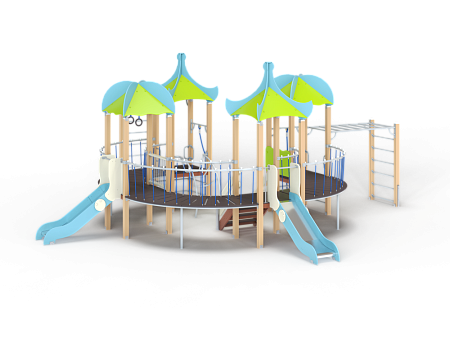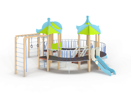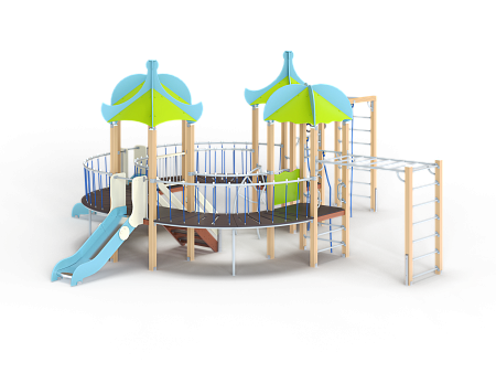 Детский игровой комплекс состоит из четырёх последовательно соединённых по окружности башен с крышами. На первой башне установлены шведские стенки, ручки вспомогательные, перекладина с канатами и внешняя шведская стенка с усиленным рукоходом. На второй башне установлены лестница и горка. На третьей башне установлены горка и фанерное ограждение. На четвертой башне установлены лиана, перекладина с канатом, вспомогательные ручки и гимнастический комплекс с кронштейнами с канатом и кольцами гимнастическими. Первая, вторая, третья и четвертая башни соединены дугообразными мостами.