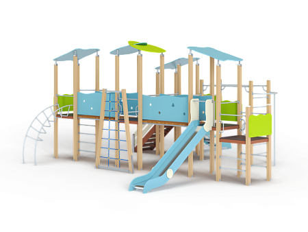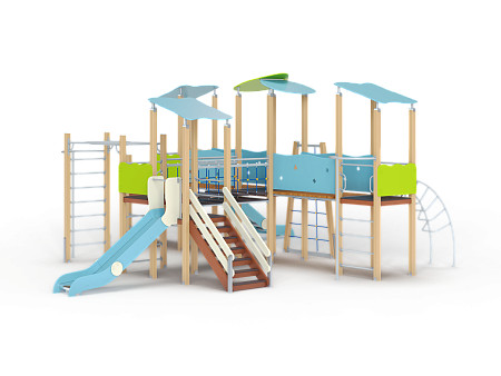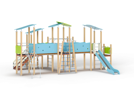 Детский игровой комплекс состоит из шести разновысоких башен, на четырех башнях установлена крыша. На первой башне установлена лестница и горка. Вторая башня соединена с третьей качающимся мостом, на ней установлено ограждение и она имеет продолжение в виде гимнастического комплекса с шестом и рукоходом. На третьей башне установлена сетка полипропиленовая. Третья башня соединена с четвертой и пятой прямыми мостами. На четвертой башне установлен шест, лиана наклонная и фанерное ограждение. На пятой башне установлена горка и ограждение. На шестой башне установлены фанерное ограждение и шведские стенки.