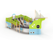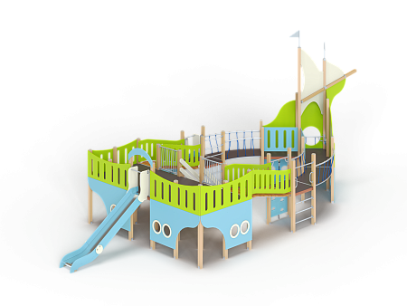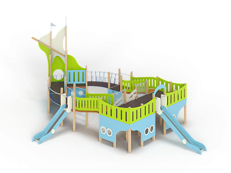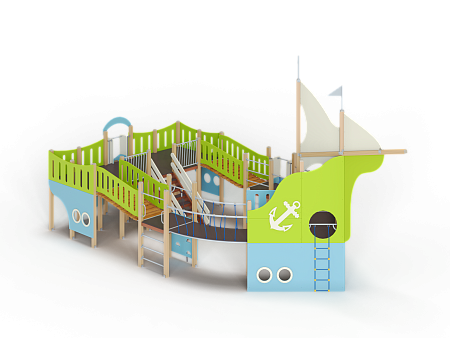 Детский игровой комплекс скомпонован в форме парусника. На боковой и на кормовой части корабля установлены две горки. По периметру корабля расположены альпинистская стенка с перекладиной и канатом, две полипропиленовые лестницы, ограждения фанерные с декоративными накладками, мосты наклонные с фанерными перилами и подвесные, перекладины, декоративные фанерные паруса и металлические декоративные флажки.