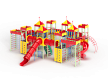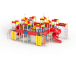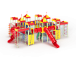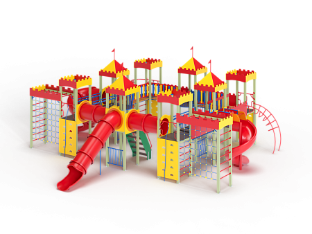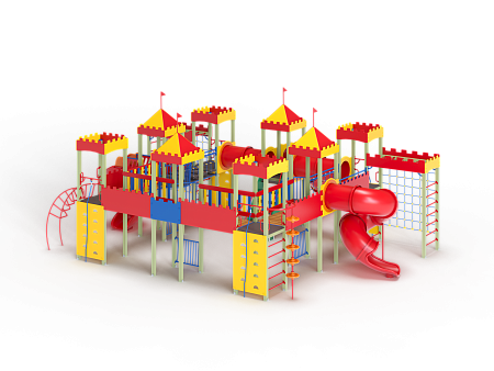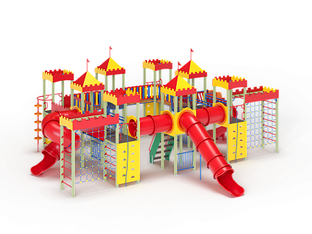 Детский игровой комплекс состоит из восьми башен с крышами. Башни расположены в форме квадрата. На первой башне установлены перекладины, шест с пластиковыми колесами, ручки вспомогательные, альпинистская стенка с перекладиной и канатом. На второй башне установлены ограждение фанерное и металлическое.. На третьей башне установлены лиана, ручки вспомогательные, альпинистская стенка с перекладиной и канатом. На четвертой башне установлена горка пластиковая винтовая, балкон. На пятой башне установлены перекладины, альпинистская стенка с перекладиной и канатом. Сбоку пятая башня имеет продолжение в виде спортивного комплекса с полипропиленовой сеткой, шведской стенкой, декоративными накладками и рукоходом. На шестой башне установлена пластиковая горка-труба, ограждение металлическое и лестница. На седьмой башне установлены перекладины, ручки вспомогательные, альпинистская стенка с перекладиной и канатом. Сбоку седьмая башня имеет продолжение в виде спортивного комплекса с полипропиленовой сеткой, шведской стенкой, фанерными накладками и рукоходом. На восьмой башне установлена винтовая пластиковая горка-труба и балкон.