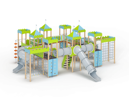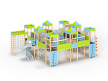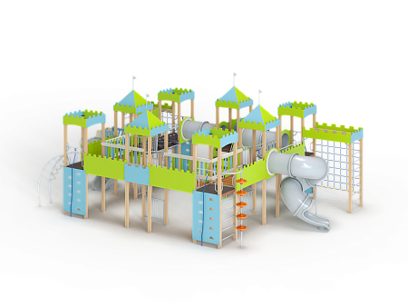 Детский игровой комплекс состоит из восьми башен с крышами. Башни расположены в форме квадрата. На первой башне установлены перекладины, шест с пластиковыми колесами, ручки вспомогательные, альпинистская стенка с перекладиной и канатом. На второй башне установлены ограждение фанерное и металлическое.. На третьей башне установлены лиана, ручки вспомогательные, альпинистская стенка с перекладиной и канатом. На четвертой башне установлена горка пластиковая винтовая, балкон. На пятой башне установлены перекладины, альпинистская стенка с перекладиной и канатом. Сбоку пятая башня имеет продолжение в виде спортивного комплекса с полипропиленовой сеткой, шведской стенкой, декоративными накладками и рукоходом. На шестой башне установлена пластиковая горка-труба, ограждение металлическое и лестница. На седьмой башне установлены перекладины, ручки вспомогательные, альпинистская стенка с перекладиной и канатом. Сбоку седьмая башня имеет продолжение в виде спортивного комплекса с полипропиленовой сеткой, шведской стенкой, фанерными накладками и рукоходом. На восьмой башне установлена винтовая пластиковая горка-труба и балкон.