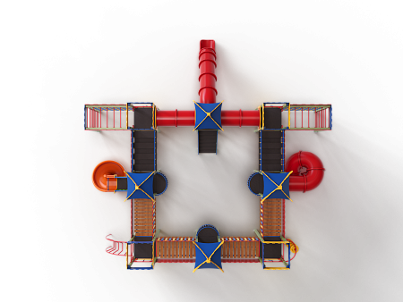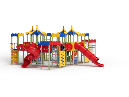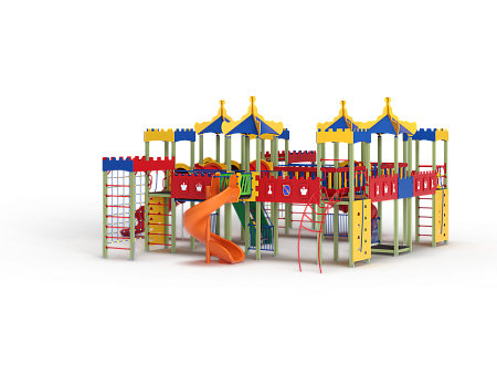 Детский игровой комплекс состоит из восьми башен с крышами. Башни расположены в форме квадрата. На первой башне установлены перекладины, шест с пластиковыми колесами, ручки вспомогательные, альпинистская стенка с перекладиной и канатом. На второй башне установлены перекладина, трап, ограждение фанерное и металлическое. На третьей башне установлены лиана, ручки вспомогательные, перекладина, альпинистская стенка с перекладиной и канатом. На четвертой башне установлена горка пластиковая винтовая, балкон. На пятой башне установлены перекладины, альпинистская стенка с перекладиной и канатом. Сбоку пятая башня имеет продолжение в виде спортивного комплекса с полипропиленовой сеткой, шведской стенкой, декоративными накладками и рукоходом. На шестой башне установлена пластиковая горка-труба, ограждение металлическое и лестница. На седьмой башне установлены перекладины, ручки вспомогательные, альпинистская стенка с перекладиной и канатом. Сбоку седьмая башня имеет продолжение в виде спортивного комплекса с полипропиленовой сеткой, шведской стенкой, фанерными накладками и рукоходом. На восьмой башне установлена винтовая пластиковая горка-труба и балкон.