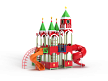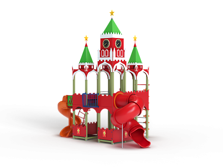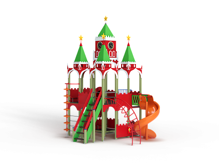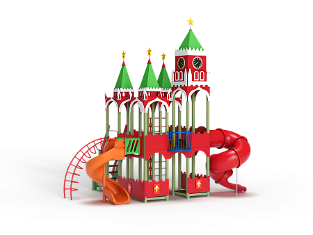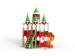 Детский игровой комплекс выполнен двухъярусным и стилизованных в виде Кремля. На первом ярусе должны быть установлены фанерные ограждения с декоративными накладками и сидения. На втором ярусе должны располагаться горка пластиковая винтовая, горка-труба пластиковая винтовая, четыре крыши, фанерные ограждения с декоративными накладками, перекладины, шест с пластиковыми колесами, сидения и лиана. Вход на второй ярус должен осуществляться через лестницу со стороны улицы.