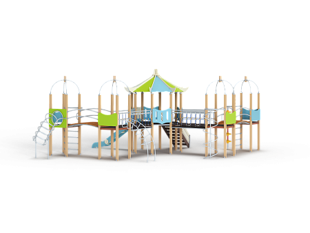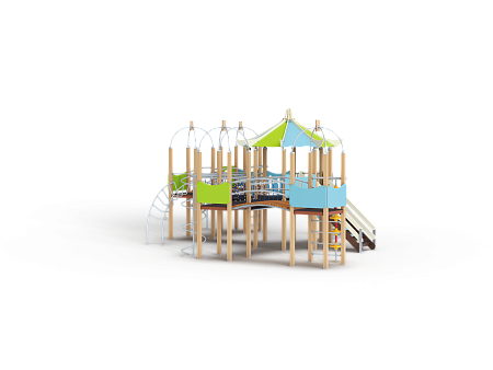 Детский игровой комплекс состоит из пяти башен. На одной башне установлена крыша в форме восьмигранной пагоды, на четырёх крыша металлическая со столбом. На восьмиграной башне установлена горка, лестница и фанерные ограждения. На башнях с металлической крышей установлены шест, шест спираль, шест с пластиковыми колесами, спираль, ограждение с круглым лазом, лиана, ручки вспомогательные, фанерные ограждения. Башни соединены двумя подвесными мостам и двумя мостами радиусными с металлическими перилами.
