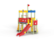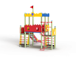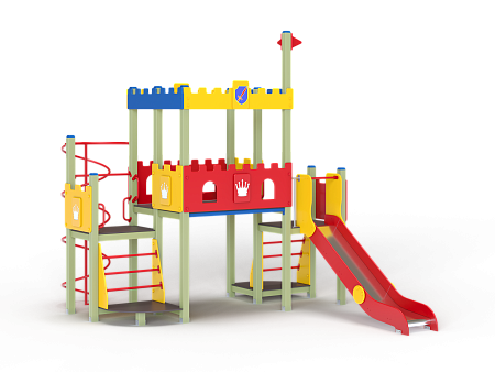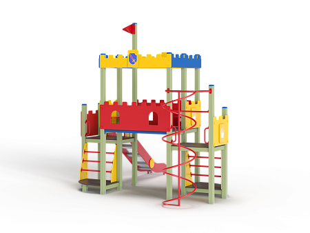 Детский игровой комплекс состоит из трех разновысоких башен. На первой башне установлена лестница, горка, фанерное ограждение и ручки вспомогательные. На второй сдвоенной башне, установлены ограждения фанерные и крыша. На третьей башне установлены ограждение, переклади-ны, шест спираль, лестница и ручки вспомогательные.