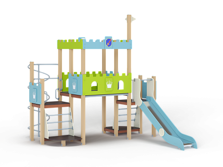 Детский игровой комплекс состоит из трех разновысоких башен. На первой башне установлена лестница, горка, фанерное ограждение и ручки вспомогательные. На второй сдвоенной башне, установлены ограждения фанерные и крыша. На третьей башне установлены ограждение, переклади-ны, шест спираль, лестница и ручки вспомогательные.