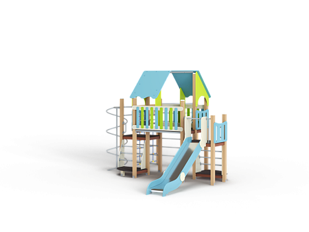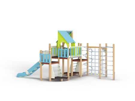 Детский игровой комплекс состоит из трех разновысоких башен. На первой башне установлена лестница, горка, фанерное ограждение и ручки вспомогательные. На второй сдвоенной башне, установлены фанерные ограждения и крыша. На третьей башне установлены ограждение, шест спираль, лестница и ручки вспо-могательные. К третьей башне присоединен гимнастический комплекс, состоящий из сетки полипропиленовой и двух шведских стенок.