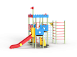 Детский игровой комплекс состоит из трех разновысоких башен. На первой башне установлена лестница, горка, фанерное ограждение с декоративными накладками и ручки вспомогательные. На второй сдвоенной башне установлены декоративные фанерные флажки, фанерные ограждения с декоративными накладками и крыша. На третьей башне установлены фанерное ограждение с декоративными накладками, шест спираль, лестница и ручки вспомогательные. К третьей башне присоединен гимнастический комплекс, состоящий из сетки полипропиленовой и двух шведских стенок.