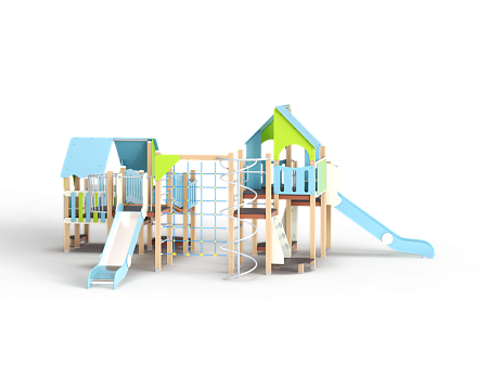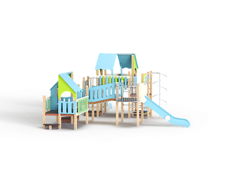 Детский игровой комплекс состоит из шести разновысоких башен. На первой башне установлена лестница, горка, фанерное ограждение и ручки вспомогательные. На второй сдвоенной башне, установлены фанерные ограждения и крыша. На третьей башне установлены фанерное ограждение, шест спираль, лестница и ручки вспомогательные. На четвертой башне установлены горка и балкон. На пятой башне установлено фанерное ограждение, лестница, вспомогательные ручки. На шестой сдвоенной установлены фанерные ограждения и крыша. Третья и четвертая башни соединены сеткой полипропиленовой, четвертая и пятая наклонным мостом с фанерными перилами.