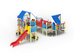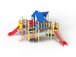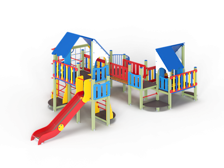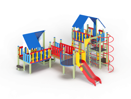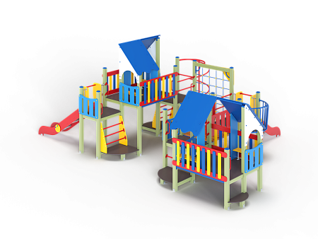Детский игровой комплекс состоит из шести разновысоких башен. На первой башне установлена лестница, горка, фанерное ограждение и ручки вспомогательные. На второй сдвоенной башне, установлены фанерные ограждения и крыша. На третьей башне установлены фанерное ограждение, шест спираль, лестница и ручки вспомогательные. На четвертой башне установлены горка и балкон. На пятой башне установлено фанерное ограждение, лестница, вспомогательные ручки. На шестой сдвоенной установлены фанерные ограждения и крыша. Третья и четвертая башни соединены сеткой полипропиленовой, четвертая и пятая прямым мостом с фанерными перилами.