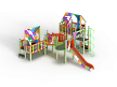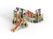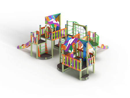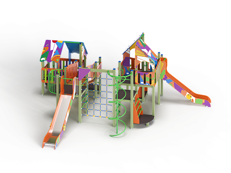 Детский игровой комплекс состоит из шести разновысоких башен с художественным оформлением в стиле граффити. На первой башне установлена лестница, горка, фанерное ограждение и ручки вспомогательные. На второй сдвоенной башне, установлены фанерные ограждения и крыша. На третьей башне установлены фанерное ограждение, шест спираль, лестница и ручки вспомогательные. На четвертой башне установлены горка и балкон. На пятой башне установлено фанерное ограждение, лестница, вспомогательные ручки. На шестой сдвоенной установлены фанерные ограждения и крыша. Третья и четвертая башни соединены сеткой полипропиленовой, четвертая и пятая наклонным мостом с фанерными перилами.