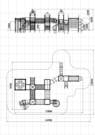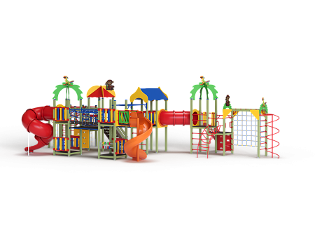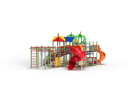 Детский игровой комплекс состоит из семи башен. На первой башне установлены лиана наклонная, альпинистская стенка с перекладиной и канатом, ручки вспомогательные, шведская стенка и имеет продолжение в виде гимнастического комплекса состоящего из сетки полипропиленовой, шеста спирали, рукохода, двух декоративных арок и шведской стенки. На второй башне установлены шведская стенка, горка и крыша с попугайчиком. На третьей башне установлены двухскатная крыша, три фанерных ограждения из балясин, шведская стенка и ручки вспомогательные. На четвертой башне установлены крыша с обезьянкой, лестница, ручки вспомогательные. На пятой башне установлены фанерное ограждение из балясин, альпинистская стенка с перекладиной и канатами. Пятая башня имеет продолжение в виде гимнастического комплекса состоящего из: сетки полипропиленовой, перекладин с лестницами, канатом и кольцами гимнастическими и шведских стенок. На шестой (разноуровневой) башне установлены фанерные ограждения из балясин, крыша с попугайчиком, пластиковой винтовой горкой-трубой. На седьмой башне установлены фанерные ограждения из балясин, детские счёты с пластиковыми бубликами, горки пластиковая винтовая, ручки вспомогательные. Вторая и третья башня соединены изогнутой трубой переходом, третья и четвертая мостом прямым с фанерными перилами, четвертая и шестая разновысоким мостом с металлическими перилами, шестая и седьмая подвесным качающимся мостом, третья и седьмая рукоходом усиленным.