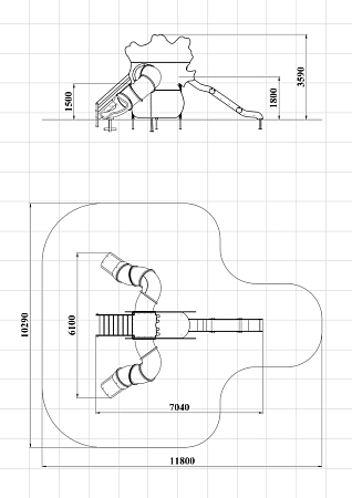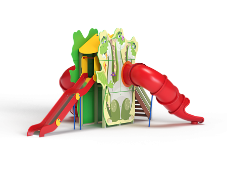 Детский игровой комплекс состоит из башни с полубашней. На полубашне установлены лестница, две горки-трубы винтовые, фанерные ограждения. На башне установлены фанерные ограждения, перекладина, ручки вспомогательные и горка. Всё ограждение фанерное имеет художественно оформленную поверхность и скомпоновано в виде трёхглавого дракона.