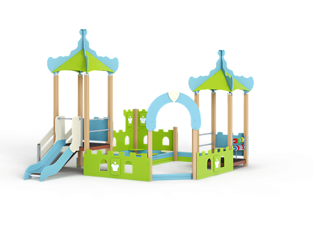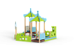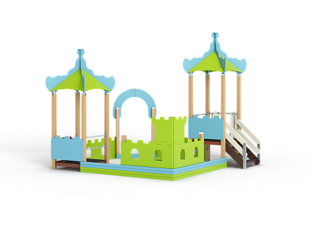 Песочный дворик – модульная конструкция из игровых и развивающих элементов с шахматной тематикой. Конструкция оборудована двумя башнями беседками, одной аркой, песочницей, ограждением по периметру из деревянного бруса и фанеры с декоративными накладками с художественным оформлением. Башни беседки оборудованы крышами, горкой, лестницей, металлическими перекладинами, фанерным ограждением, детскими счетами с пластиковыми бубликами и сидением. Песочница с четырьмя фанерными накладками и декоративным фанерным ограждением в наружном углу в форме шахматной фигуры ладья.