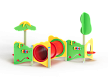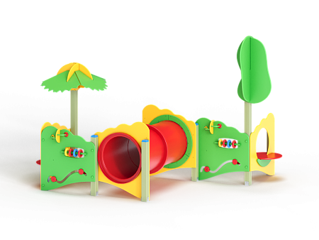 Лабиринт состоит из столбов и крепящихся к ним фанерных стенок с игровым оборудованием в виде мишеней, головоломок, детских счет, трубы-перехода пластиковой и фанерных столиков. На двух столбах установлены две декоративные фанерные крыши в форме кроны дерева и пальмы.