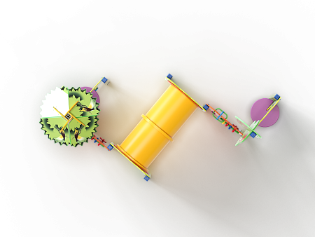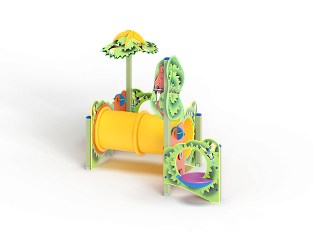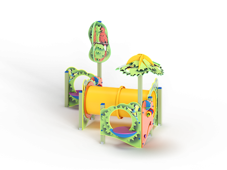 Лабиринт состоит из столбов и крепящихся к ним фанерных стенок с игровым оборудованием в виде мишеней, головоломок, детских счет, трубы-перехода пластиковой и фанерных столиков. На двух столбах установлены две декоративные фанерные крыши в форме кроны дерева и пальмы с художественным оформлением в виде тропических птиц.