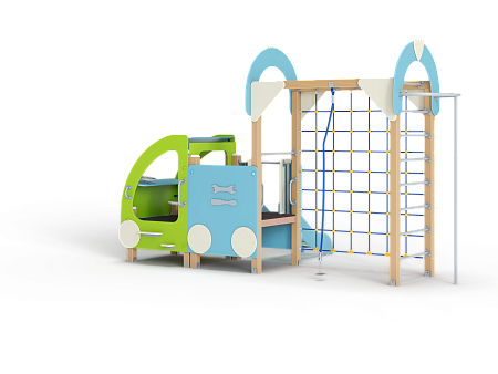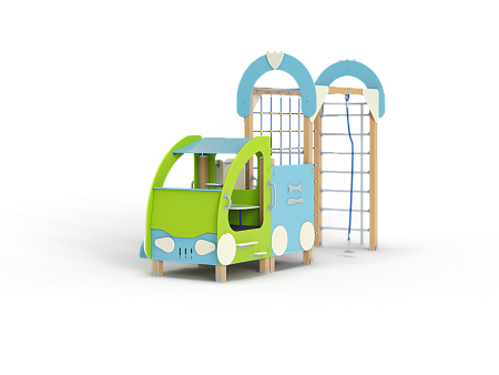 Пожарная машина состоит из кабины, кузова, горки и вынесенного спортивного комплекса. Вынесенный спортивный комплекс состоит из шеста, каната, шведской стенки, рукохода, сетки полипропиленовой для лазания и фанерных декоративных элементов. Кабина имеет вход с двух сторон, по две ступеньки и по две ручки с каждой стороны, вращающийся руль и сидение. Кузов - открытая площадка имеет один вход и горку. Один борт имеет художественно оформленную поверхность в тематике экстренных служб.