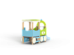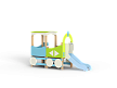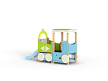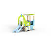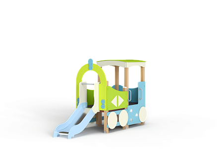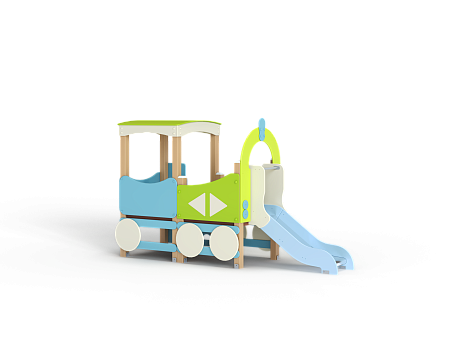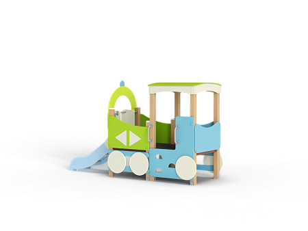 Паровозик состоит из кабины с крышей и котла с горкой. Кабина имеет вход в виде альпинистской стенки и две вспомогательные ручки, фанерное ограждение и крыша. Котел - открытая площадка с горкой, декоративной аркой и фанерным ограждением с художественным оформлением. Снизу по бокам расположены декоративные колеса.