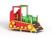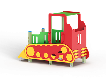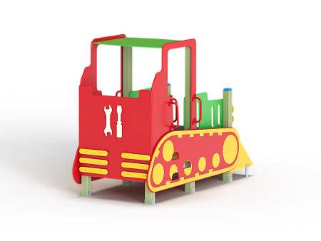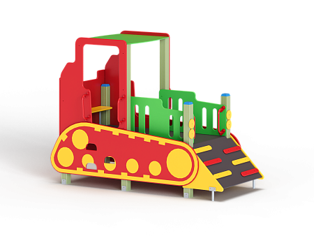 Бульдозер состоит из крыши, ограждений в виде деталей бульдозера, трапа, ручек, лавочки и декоративных элементов.