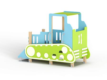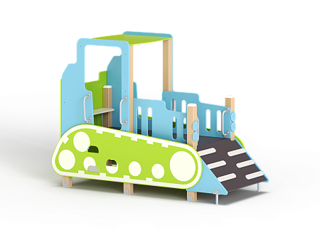 Бульдозер состоит из крыши, ограждений в виде деталей бульдозера, трапа, ручек, лавочки и декоративных элементов.