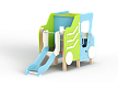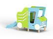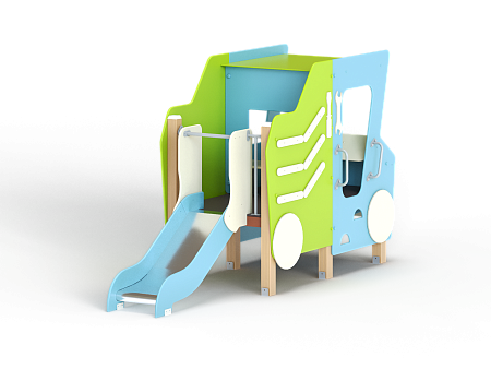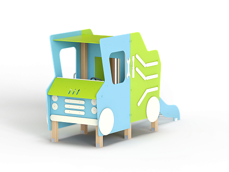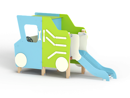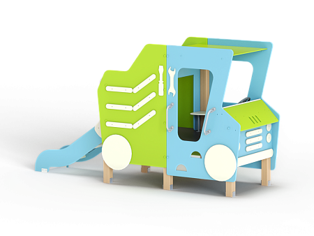 Самосвал состоит из горки, крыши, ограждений в виде деталей кузова самосвала, лавочки, руля, ручек и декоративных фанерных элементов.